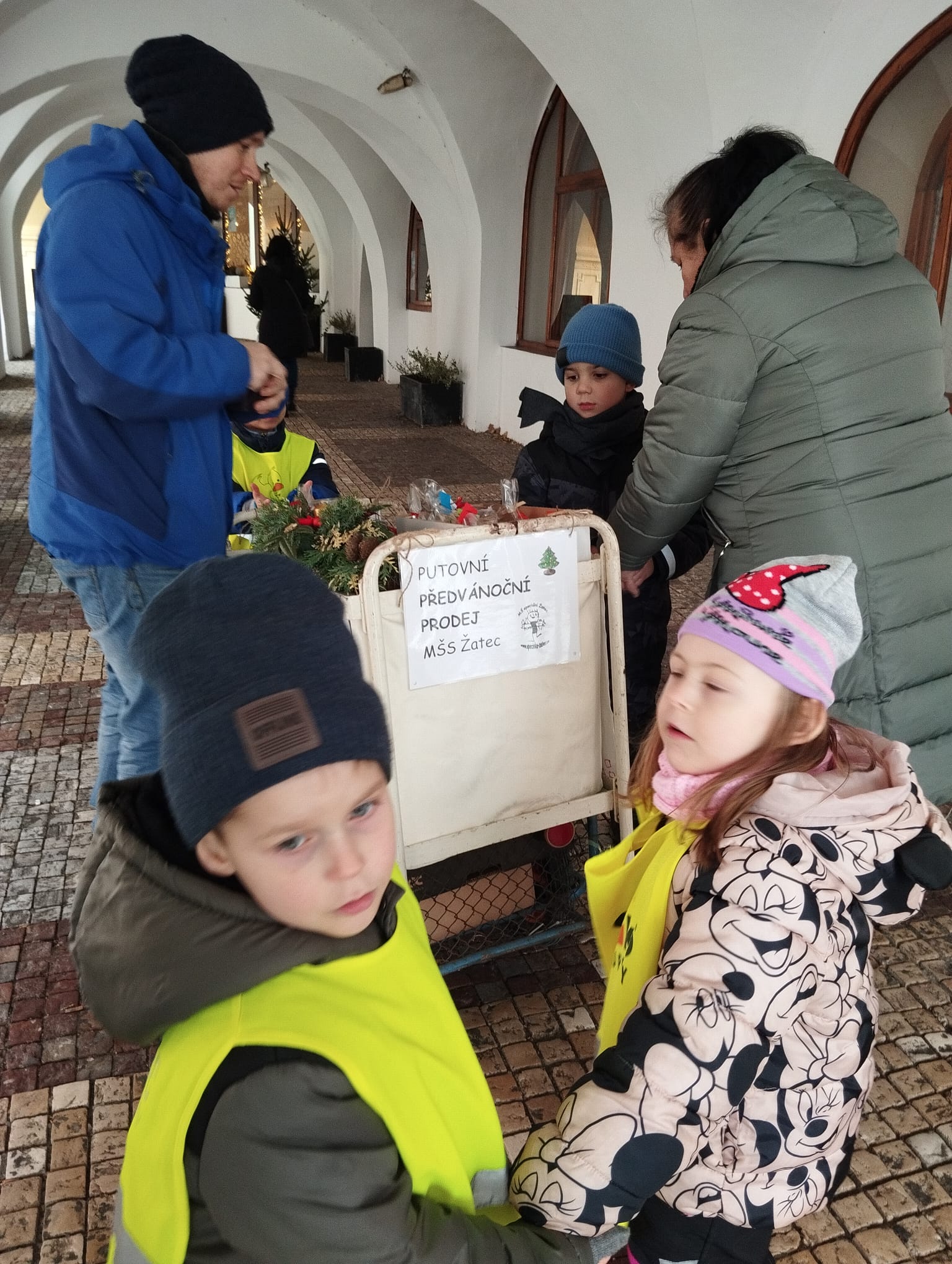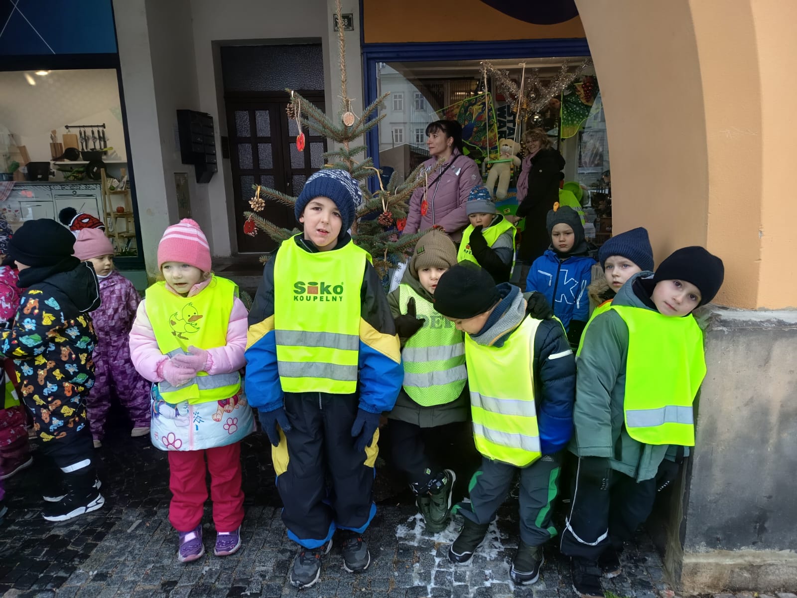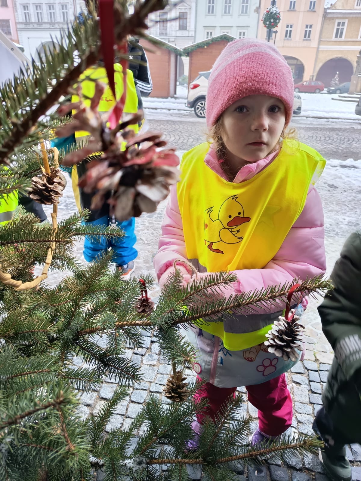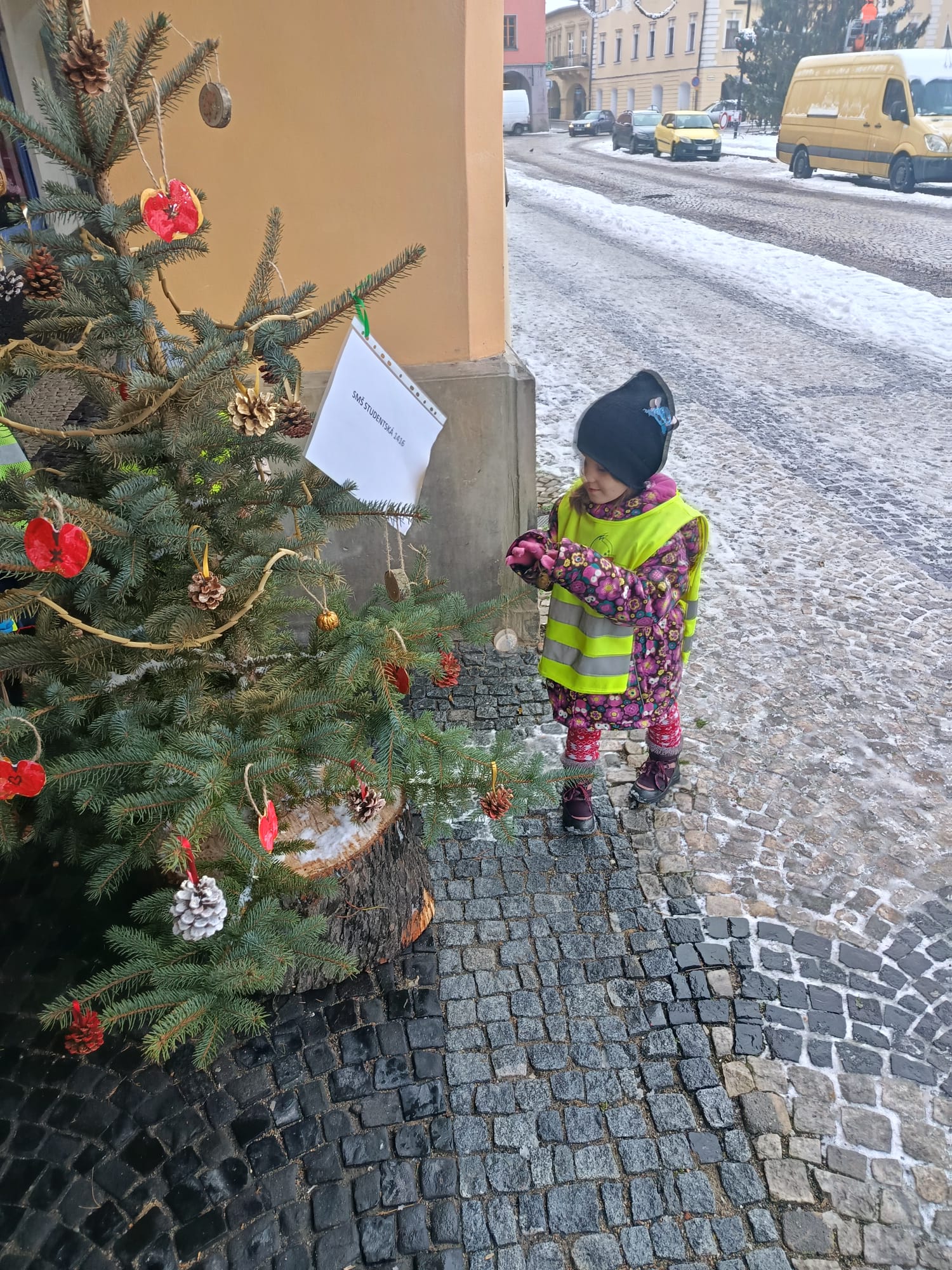 V úterý jsme se při procházce vydali na náměstí Svobody v Žatci ke stromečku, na který každá třída předchozí dny vyrobila závěsné ozdoby a řetězy. Stromeček se nachází v podloubí mezi obchodem s kuchyňskými potřebami Orion a papírnictvím.