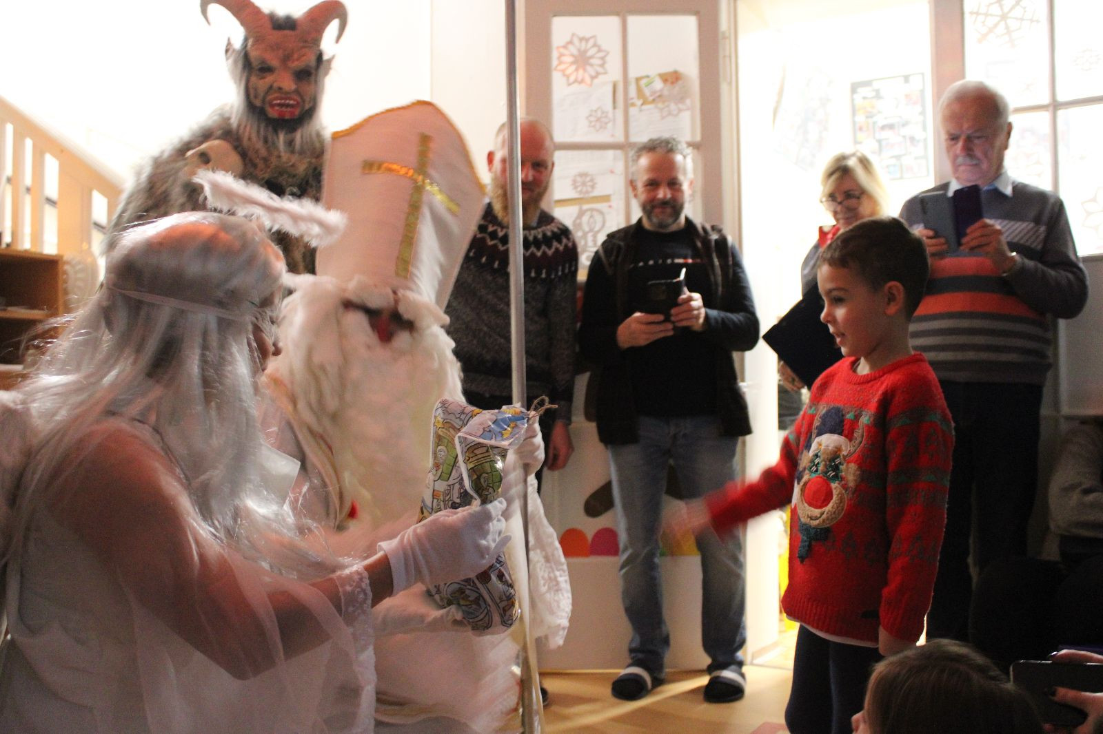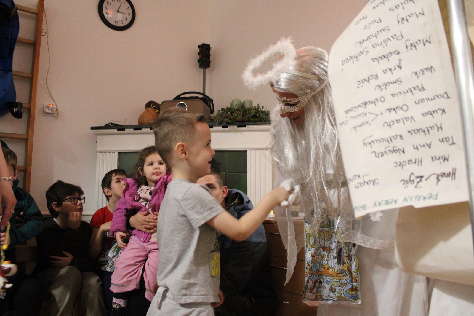 v 18.23Ve čtvrtek 4. prosince nás nenavštívil nikdo jiný, než Mikuláš, anděl a čert. Děti mu zazpívaly písně, které jsme u klavíru trénovali předchozí dny a Mikuláš jim poté s pomocníky rozdal balíčky s nadílkou. Děkujeme za hojnou účast!