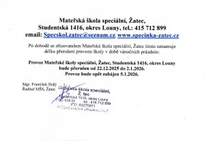Po dohodě se zřizovatelem Mateřská škola speciální, Žatec tímto oznamuje délku přerušení provozu školy v době vánočních prázdnin: